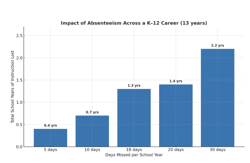 Typically, over the course of a K–12 career, a student goes to school, or is supposed to go to school, about 2,340 days. Naturally, missing significant portions of time can mean graduating without essential skills. When thinking about a student’s education, most people do not think of it holistically. Yet, those many days of consistent learning each year provide structure for mastering grade-level standards and building literacy, numeracy, and problem-solving skills. Missing extensive periods of that time creates gaps that accumulate throughout a student’s academic career. In my experience as a teacher, principal, and district administrator, I have seen firsthand how missing school – and missing often – can derail a student’s ability to be successful in school.